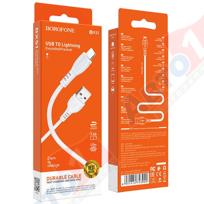Borofone 43909 Кабель BX51 Lightning-USB 2,4A белый, 1 метр /мин.пар.3шт