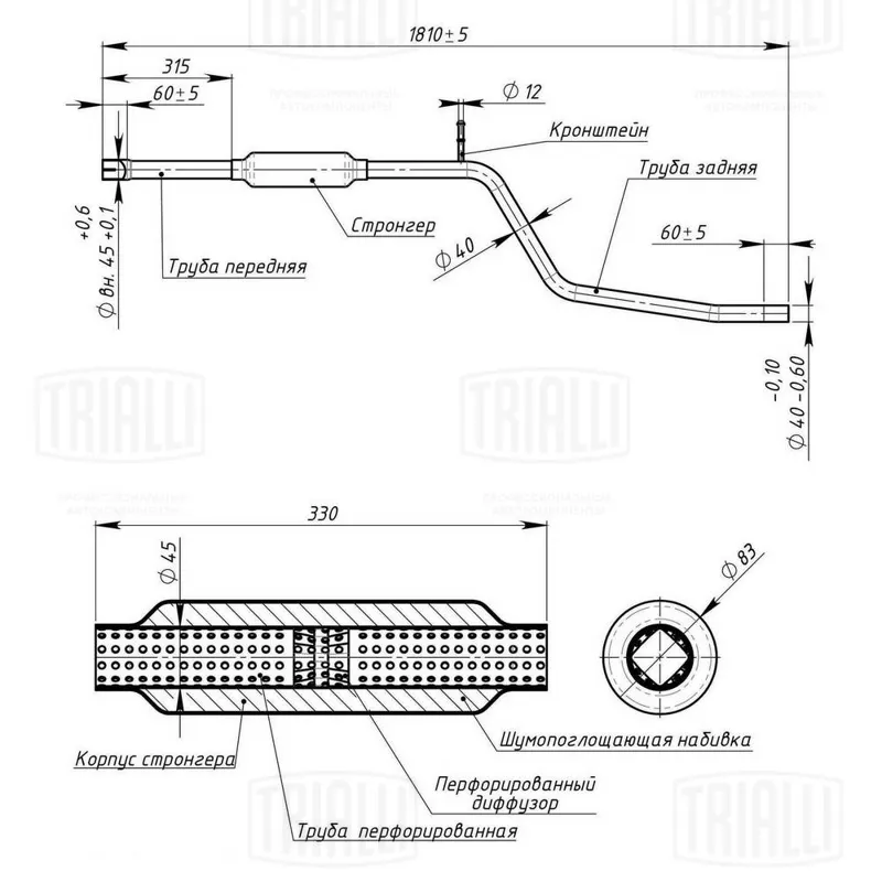 - Глушитель универсальный круглый (L=330, d=50, D=88) с перфорированным диффузором (TRIALLI)
