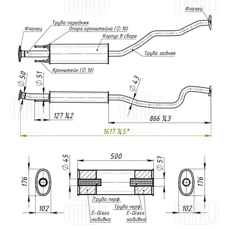 - Глушитель универс. (овальный) 97х171, L=500, d=50 (нерж. алюм. сталь) (EMM 3506)