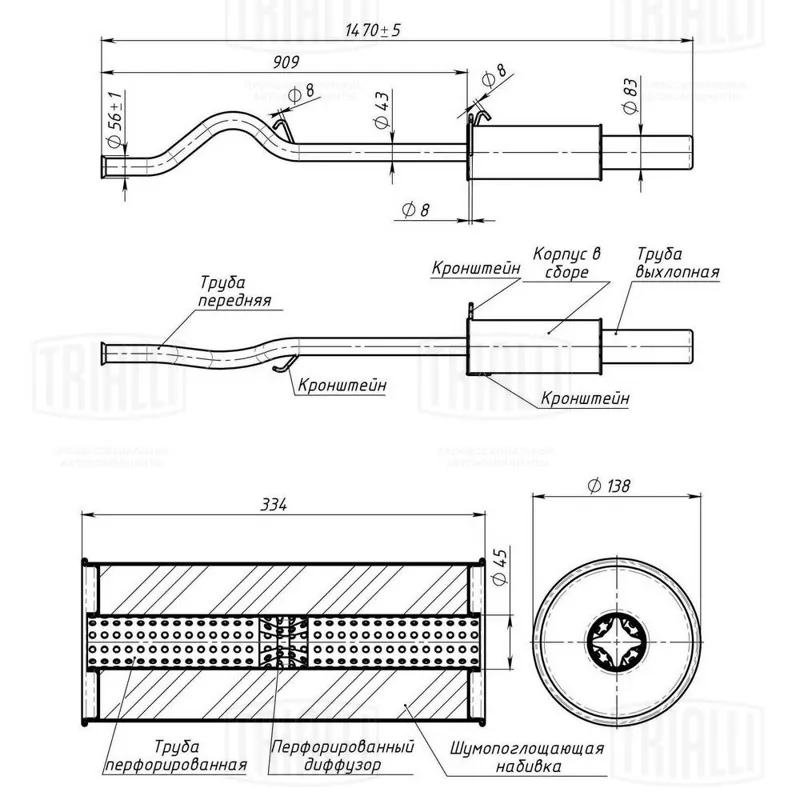- Глушитель универс. (овальный) 137х226 с перф. диффузором L=540, d=42 (нерж. алюм. сталь) (EMM 3405)