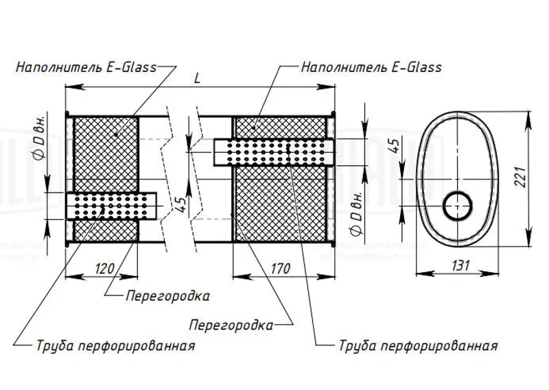 - Глушитель универсальный овальный (L=430, d=42) 131х221 смещ. 45мм (TRIALLI)!!!!