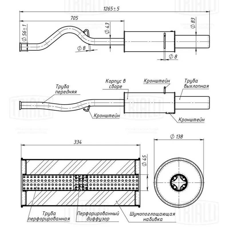 - Глушитель универс. (овальный) 137х226 с перф. диффузором L=540, d=42 (нерж. алюм. сталь) (EMM 3405)