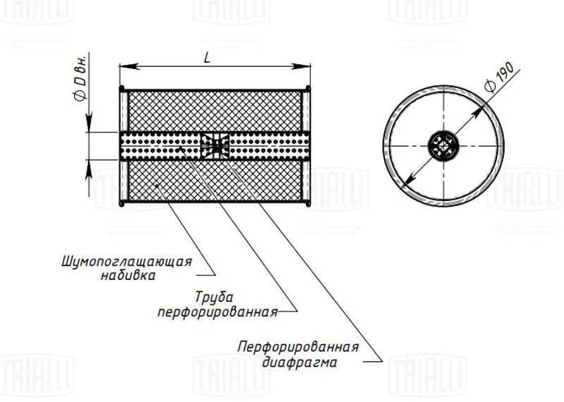 - Глушитель универсальный круглый (L=310, d=50, D=190) с перфорированным диффузором (TRIALLI)