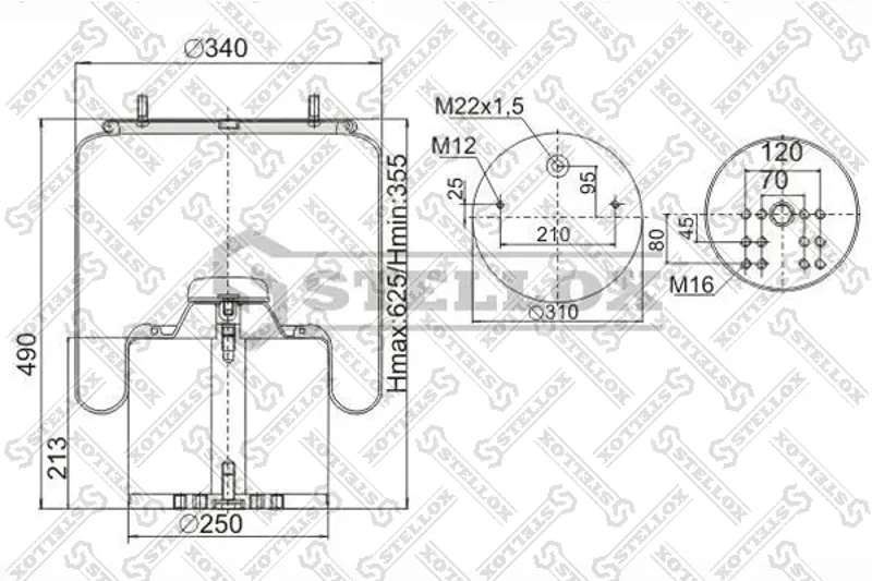 • пневмоподушка без стакана !h600 2шп.M12смещ.25. 1отв.штуц.M22. Н: 1шп.M16\ BPW 36-1