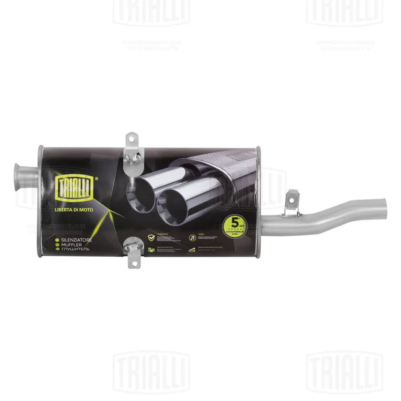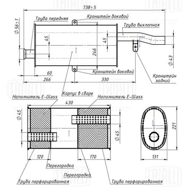 - Глушитель универсальный овальный (L=430, d=42) 131х221 смещ. 45мм (TRIALLI)!!!!