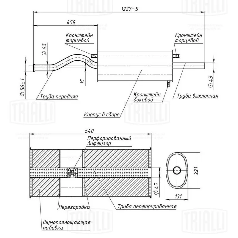- Глушитель универс. (овальный) 137х226 с перф. диффузором L=540, d=42 (нерж. алюм. сталь) (EMM 3405)