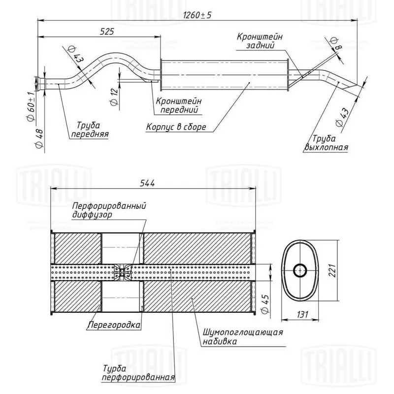 - Глушитель универс. (овальный) 137х226 с перф. диффузором L=540, d=42 (нерж. алюм. сталь) (EMM 3405)