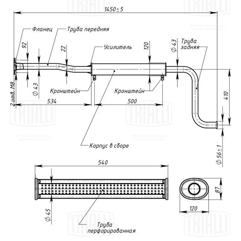 - EMM 3406_глушитель универсальный! (овальный) 87х120 с перфорированным диффузором L540, d42\ (Россия)
