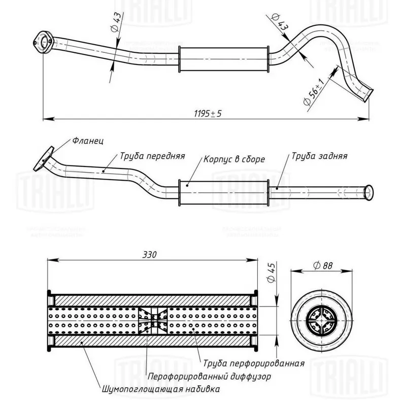 - Глушитель универсальный круглый (L=330, d=42, D=88) с перфорированным диффузором (TRIALLI)