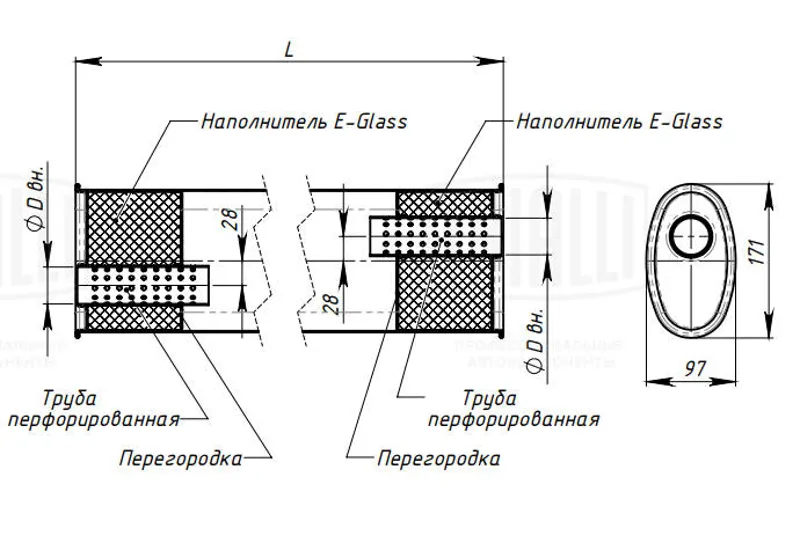 - CBD430.039 Глушитель Нержавеющий. Овал D187x117, L350. Отверстия с разных сторон смещенные (2:2) под трубу 51мм CBD430.039