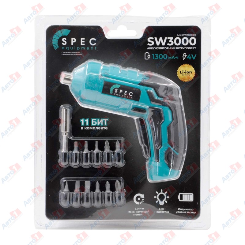 Spec SSW3000.00 Шуруповерт аккумуляторный(отв-ка)SPEC SW3000(4В,1 акк,1,3А/ч Li-ion,3Нм,шур.до 4мм,11 бит в компл.)