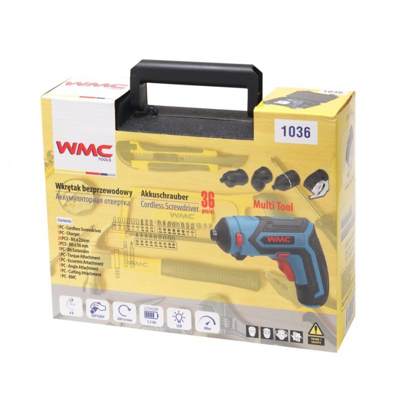 WMC TOOLS WMC-1036 Шуруповерт аккумуляторный с набором бит и аксессуаров 36пр(4V,1.5Ah,4Nm),в кейсе