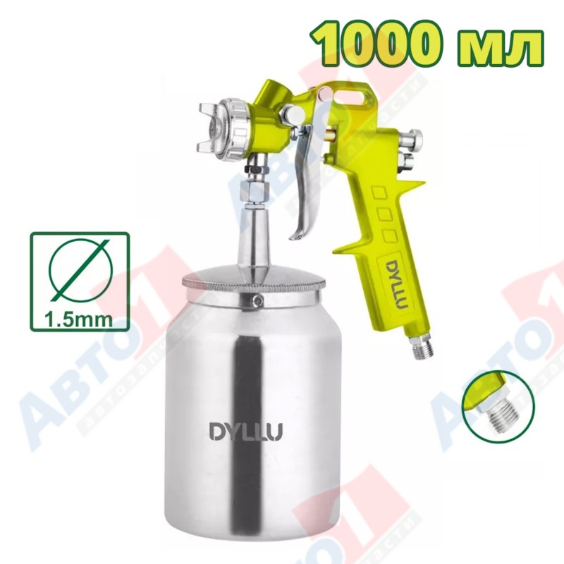 DYLLU DTGA1510 Краскораспылитель пневматический DTGA1510 1,5 мм/1,2-1,8 мм; Ширина рисунка: 180-250 мм; 1000 мл; 3-4 бар; 119-200 л/мин Пневматический пистолет-распылитель - 1шт; Бачок 1000 мл - 1шт;